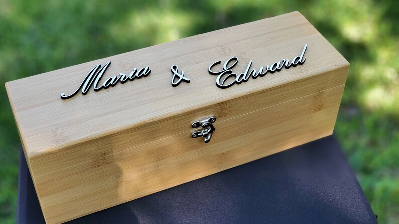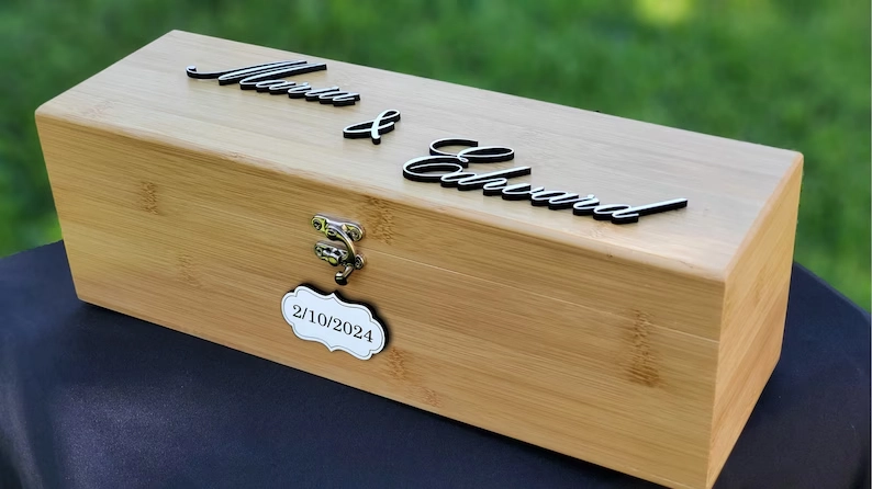 Elegant personalized bamboo wine box with custom engraved names and date—perfect for weddings, anniversaries, engagements, and special occasions.