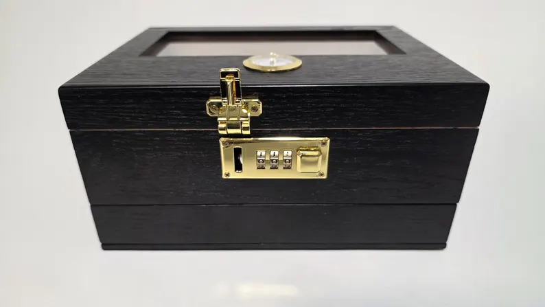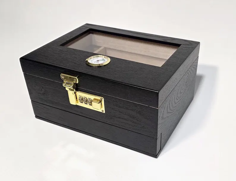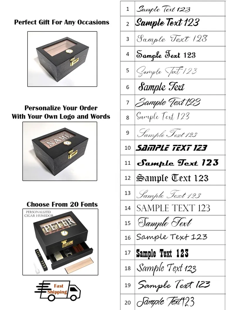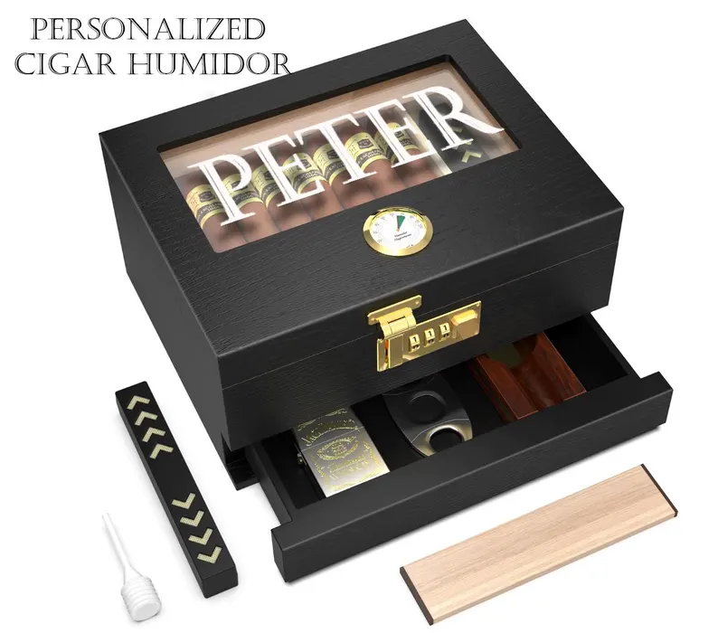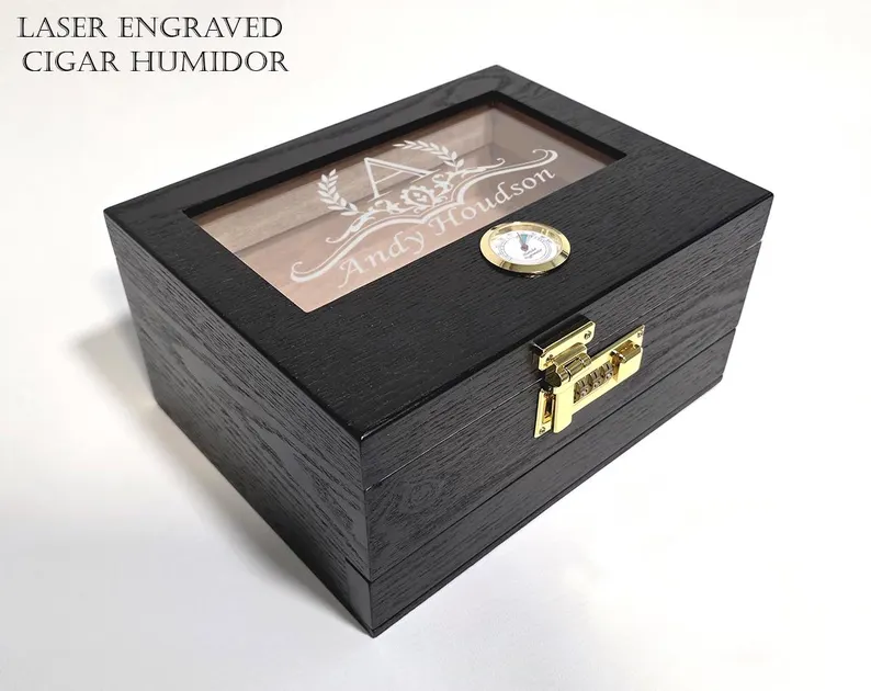 Crafted from high-quality Spanish cedar wood, this personalized cigar humidor keeps cigars perfectly fresh by maintaining ideal humidity. Includes a secure gold-plated lock, front hygrometer, and a crystal-clear glass top for elegant display.