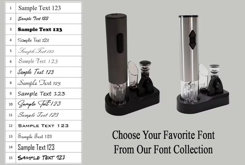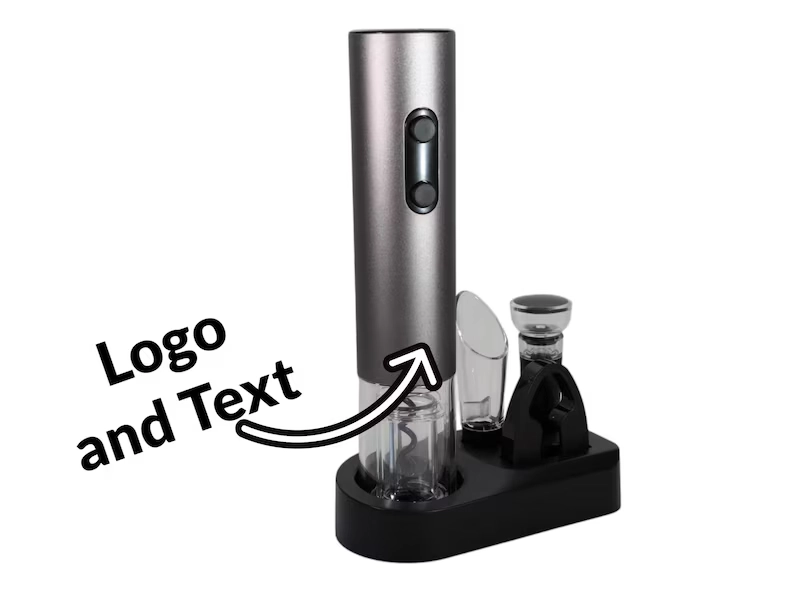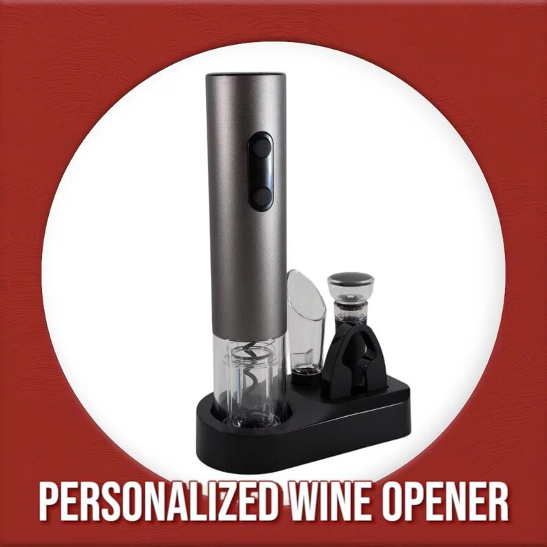 • Sleek personalized electric wine opener set with custom engraving—includes foil cutter, wine stopper, and pourer. Perfect for wine lovers and special gifts.